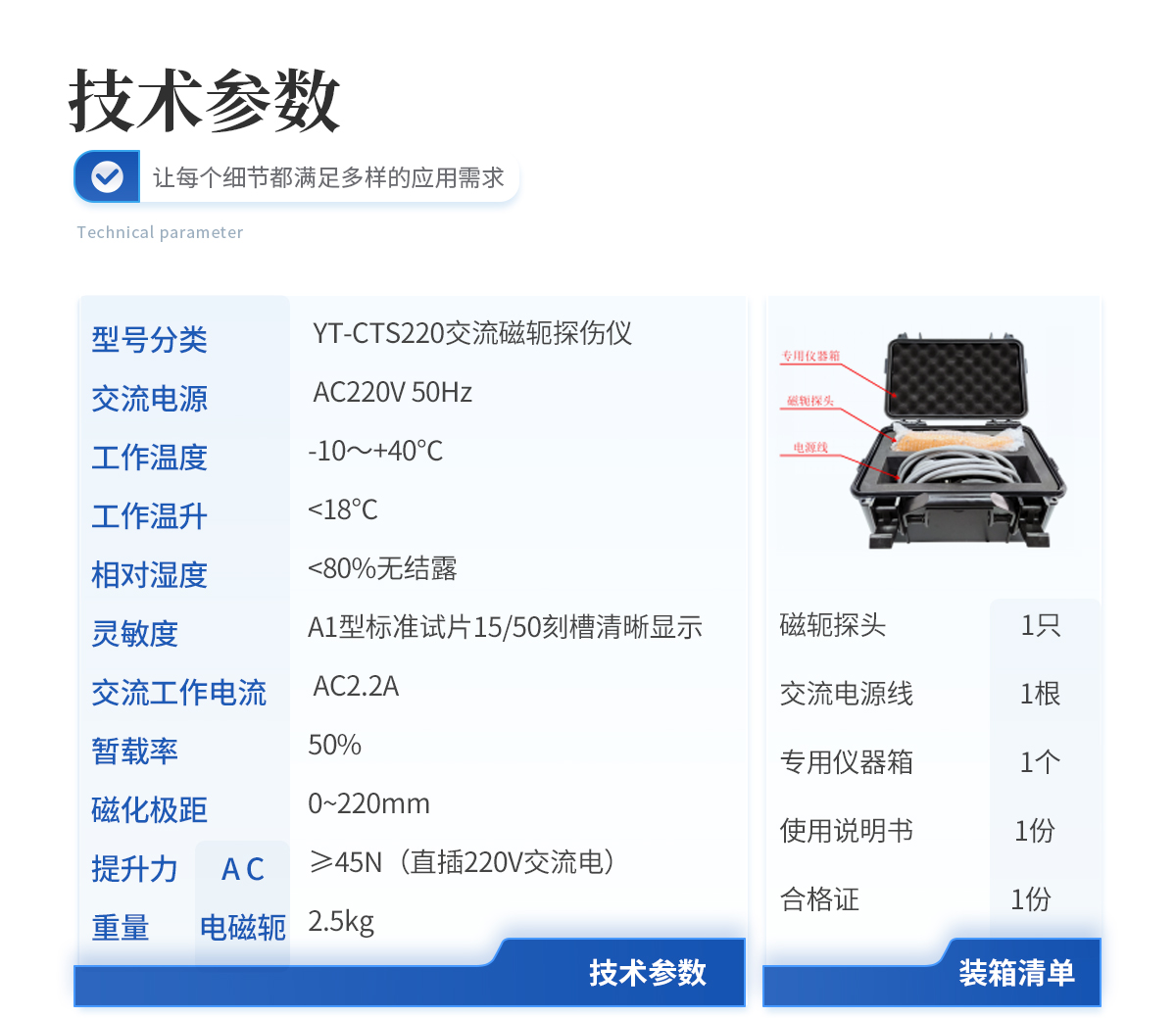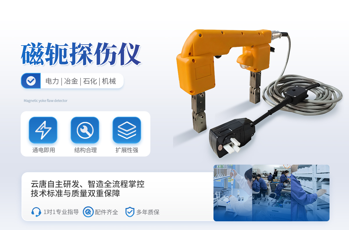 YT-CTS220C型電磁軛磁粉探傷儀,無(wú)主機(jī)設(shè)計(jì),操作簡(jiǎn)單方便,噪音小、重量輕、工作穩(wěn)定。配直流磁化電源(鋰電),具有交流與直流磁化功能,適用于野外無(wú)電源現(xiàn)場(chǎng)操作以及高壓不能進(jìn)入的容器、橋梁、管道等現(xiàn)場(chǎng)操作,一次充電連續(xù)工作時(shí)間可達(dá)6小時(shí)以上。交流供電電源采用~220V電源直接輸入,無(wú)需其他儀器配套,操作方便、簡(jiǎn)單、重量輕、便于攜帶,因而該儀器得到廣泛使用。