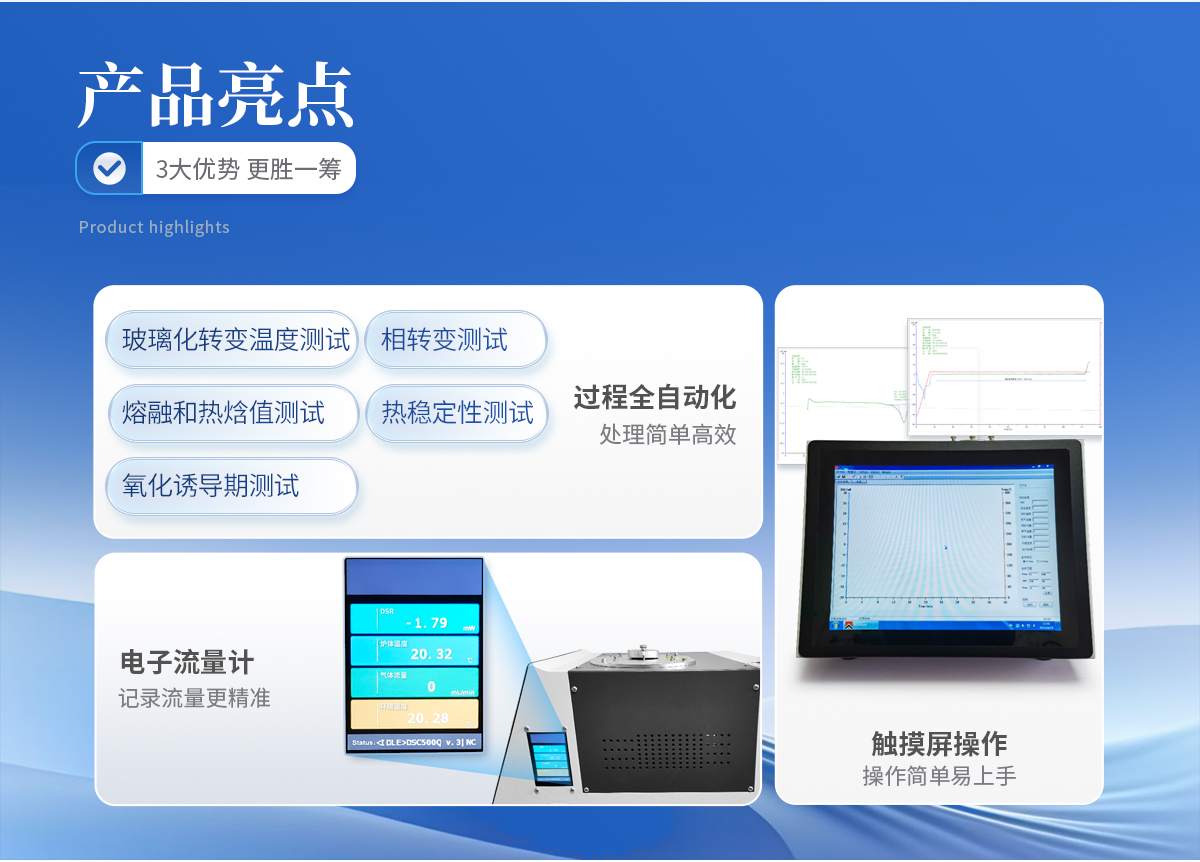差示掃描量熱儀為觸摸屏式,可進(jìn)行玻璃化轉(zhuǎn)變溫度測(cè)試、相轉(zhuǎn)變測(cè)試、熔融和熱焓 值測(cè)試、產(chǎn)品穩(wěn)定性、氧化誘導(dǎo)期測(cè)試。