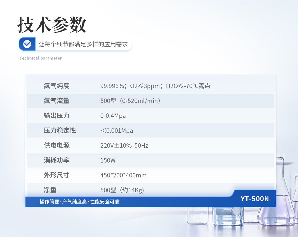 1、氮氣純度: 99.996%;O2≤3ppm;H2O≤-70℃露點 2、氮氣流量: 500型(0-520ml/min) 3、輸出壓力: 0-0.4Mpa 4、壓力穩(wěn)定性:<0.001Mpa 5、供電電源: 220V±10% 50Hz 6、消耗功率: 150W 7、外形尺寸: 450*200*400mm 8、凈重: 500型(約14Kg)