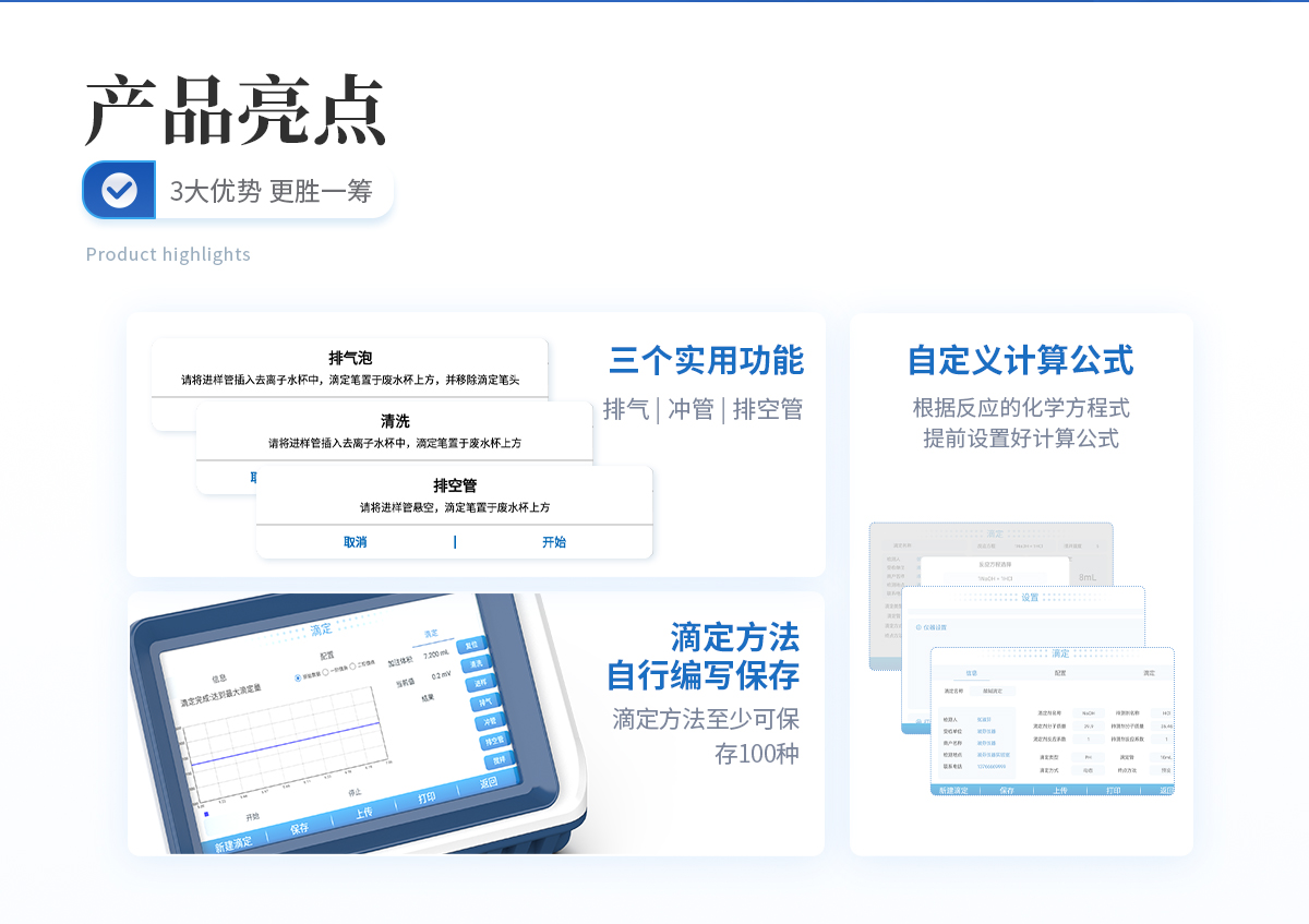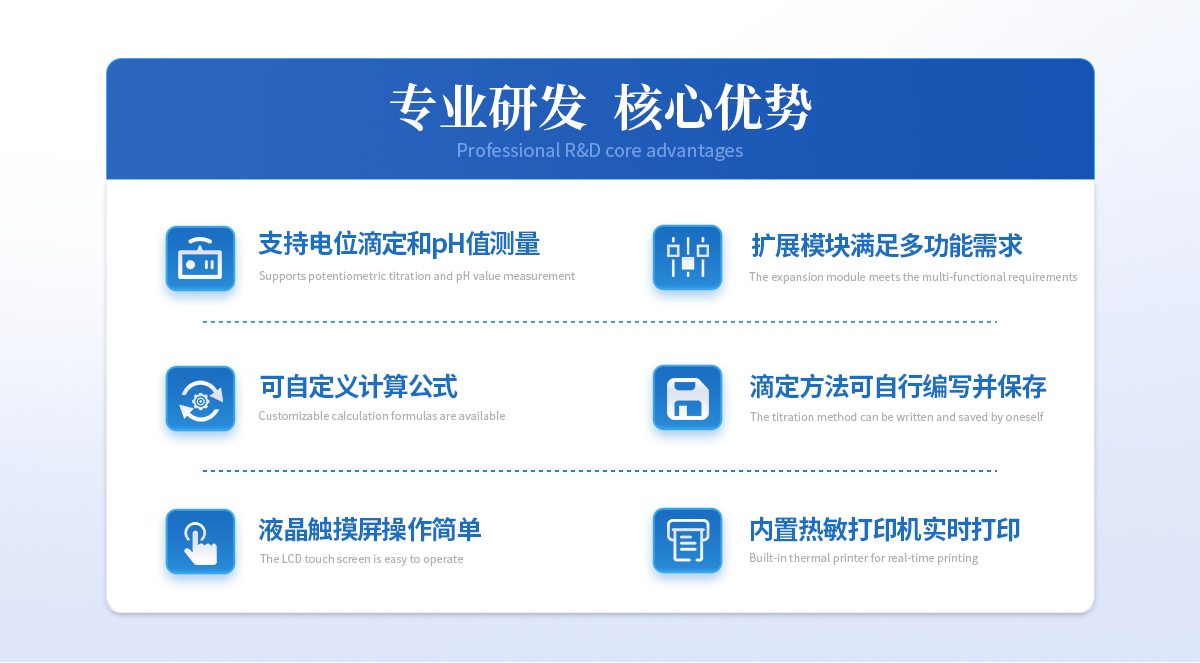 | 1、設(shè)備支持電位滴定和pH值測(cè)量;用戶(hù)選擇不同電極可進(jìn)行酸堿滴定、氧化還原滴定、沉淀滴定、絡(luò)合滴定等多種滴定和pH測(cè)量; | 2、用戶(hù)可選配電導(dǎo)滴定、永停滴定等擴(kuò)展模塊,滿(mǎn)足用戶(hù)多功能需求; | 3、設(shè)備對(duì)國(guó)家標(biāo)準(zhǔn)中采用的電位滴定法均滿(mǎn)足,用戶(hù)可根據(jù)檢測(cè)需求選擇適配的電極即可; | 4、支持動(dòng)態(tài)滴定、等量滴定、手動(dòng)滴定的滴定方式,可預(yù)設(shè)滴定終點(diǎn)或自動(dòng)識(shí)別終點(diǎn)滴定,方便用戶(hù)根據(jù)樣品特性選擇**滴定工作流程; | 5、可自定義計(jì)算公式,根據(jù)反應(yīng)的化學(xué)方程式提前設(shè)置好計(jì)算公式,滴定完成后將自動(dòng)獲得待測(cè)物含量; | 6、滴定方法可自行編寫(xiě)并保存,形成滴定方法快捷模式,在使用時(shí)可直接選擇運(yùn)行,滴定方法至少可保存100種; | 7、設(shè)備可作為實(shí)驗(yàn)室常規(guī)手動(dòng)滴定的滴定裝置使用;計(jì)量泵替代滴定管,磁力攪拌功能替代手動(dòng)搖晃錐形瓶的工作; | 8、儀器實(shí)用的三個(gè)功能: (1)排氣,可將滴定管或管路內(nèi)的氣泡排出,避免氣泡帶來(lái)的滴定誤差; (2)沖管,可以*少的試劑消耗量使管路內(nèi)充滿(mǎn)試劑,實(shí)現(xiàn)節(jié)省試劑的同時(shí)減少試劑混合引入的滴定誤差; (3)排空管,可在實(shí)驗(yàn)完成后將管路中的液體收集到滴定管內(nèi),避免在拆卸管路時(shí)產(chǎn)生藥液濺灑問(wèn)題。 |