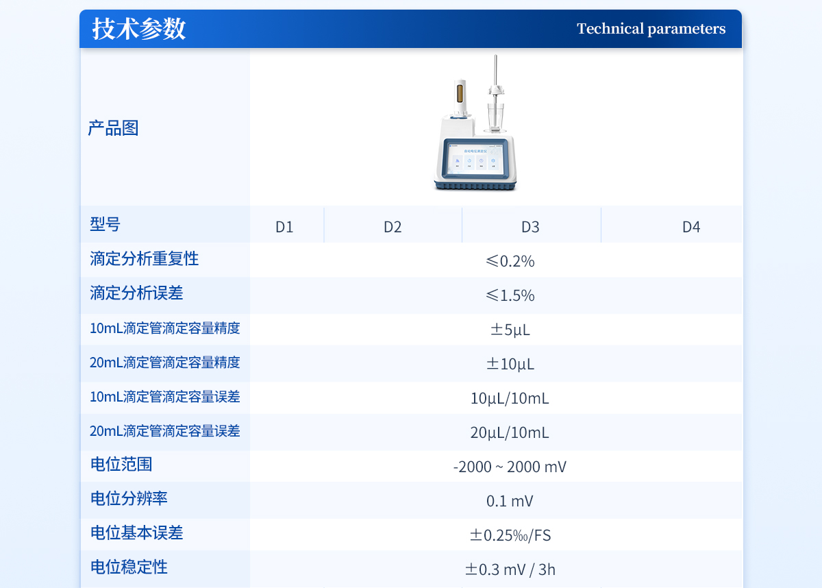 | 自動(dòng)電位滴定儀是一種用于化學(xué)分析的精密儀器,他通過(guò)自動(dòng)添加滴定劑來(lái)確定樣品中特定成分的濃度。該儀器基于電位滴定原理工作,即根據(jù)在滴定過(guò)程中電池電動(dòng)勢(shì)的變化來(lái)確定滴定終點(diǎn)的一款滴定設(shè)備。設(shè)備滿(mǎn)足國(guó)家檢定規(guī)程JJG 814-2015《自動(dòng)電位滴定儀》儀器級(jí)別中的0.05級(jí)別,即儀器**示值誤差為±1.5%,儀器示值重復(fù)性≤0.2% |