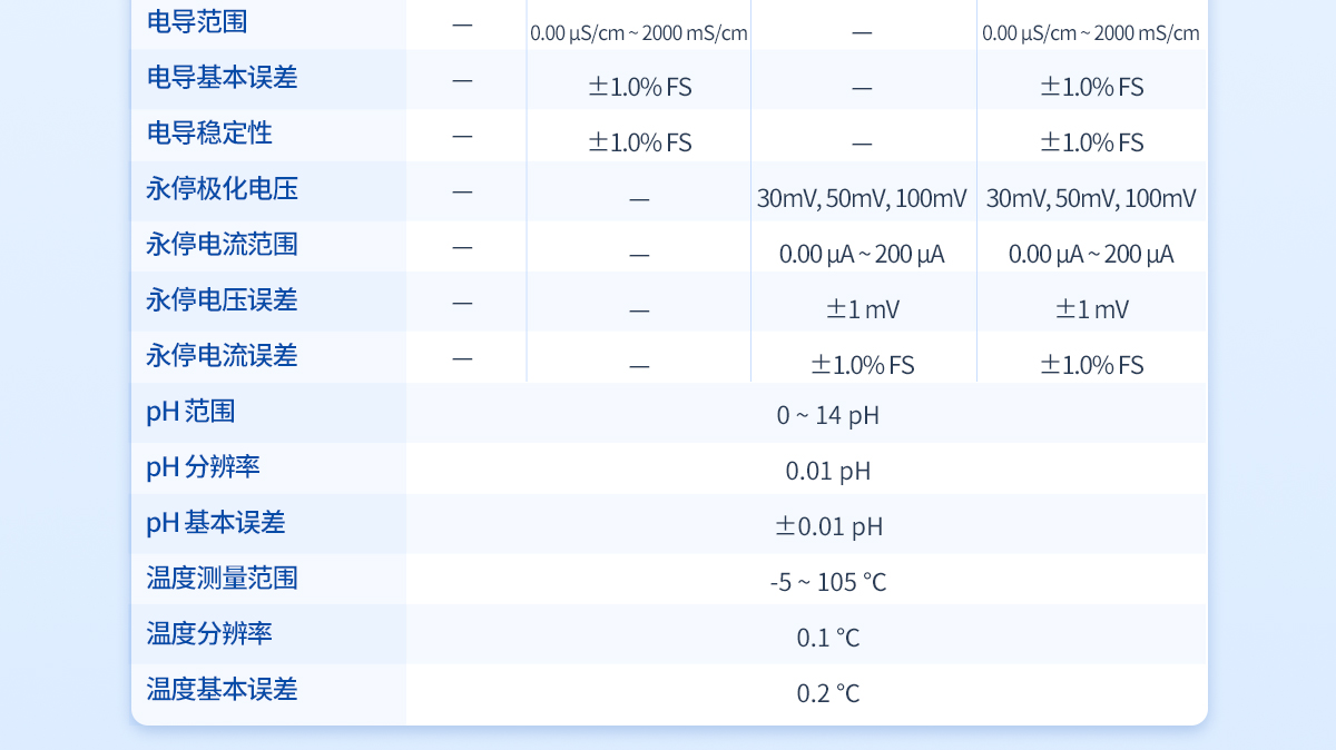 | 滴定分析重復(fù)性:≤0.2% | 滴定分析誤差:≤1.5% | 10mL滴定管滴定容量精度:±5μL | 20mL滴定管滴定容量精度:±10μL | 10mL滴定管滴定容量誤差:10μL/10mL | 20mL滴定管滴定容量誤差:20μL/10mL | 電位范圍:-2000—2000mV | 電位分辨率:0.1mV | 電位基本誤差mV:±0.25‰/FS | 電位穩(wěn)定性mV:±0.3mV/3h | 電導(dǎo)范圍:0.00uS/cm-2000mS/cm | 電導(dǎo)基本誤差:±1.0% FS | 電導(dǎo)穩(wěn)定性:±1.0% FS | pH范圍:0-14PH | pH分辨率:0.01PH | pH基本誤差:±0.01PH | 溫度測(cè)量范圍:-5 - 105℃ | 溫度分辨率:0.1℃ | 溫度基本誤差:0.2℃ |