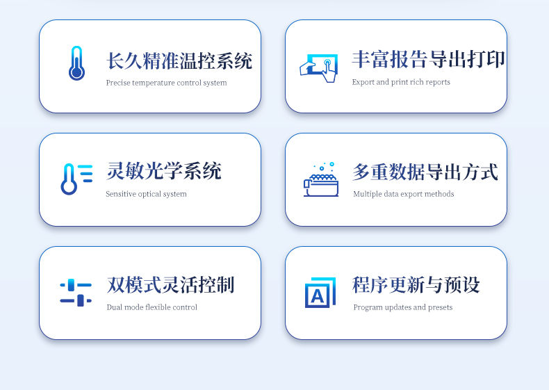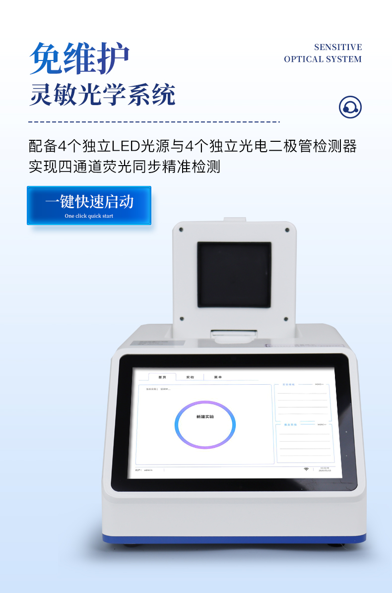 | 1.智能操作系統(tǒng),實驗盡在掌握 | A雙模式靈活控制:支持通過儀器觸摸屏獨立運行,也支持通過電腦軟件進行遠程控制與數(shù)據(jù)管理,適應不同實驗場景需求。 | B程序更新與預設(shè):支持在線更新實驗程序,并內(nèi)置豐富的預設(shè)實驗程序模板,用戶亦可自定義保存常用模版,實現(xiàn)一鍵快速啟動,極大提升操作效率。 | C極簡啟動體驗(可選配):可定制集成攝像頭掃描系統(tǒng),用戶只需掃描樣品板或程序卡的二維碼,即可自動識別并調(diào)用對應實驗程序,簡化流程,避免人為設(shè)置錯誤。 | D操作簡單:無論是觸摸屏界面還是電腦軟件,均設(shè)計得直觀易懂,新用戶也能快速上手。預置常用程序模板,進一步簡化操作流程。 | 2.精準穩(wěn)定的溫控與光學核心 | A長久精準的溫控系統(tǒng):采用進口***TEC半導體制冷模塊,控溫精準(±0.1°C),孔間溫度均勻性**(≤±0.3°C)。系統(tǒng)穩(wěn)定性卓越,長期使用性能衰減小,校準周期長達數(shù)年,顯著降低維護成本與運營中斷。 | B免維護的靈敏光學系統(tǒng):配備4個獨立LED光源與4個獨立光電二極管檢測器,實現(xiàn)四通道熒光同步精準檢測。采用超長壽命進口光源,設(shè)計壽命期內(nèi)免維護,無需額外校準或更換,保障檢測結(jié)果長期一致性與高靈敏度。 | C卓越的數(shù)據(jù)質(zhì)量:實驗線性相關(guān)性高(R2≥0.999),重復性優(yōu)異(孔間CV值低),確保定量結(jié)果準確可靠,數(shù)據(jù)置信度高 | 3.**便捷的數(shù)據(jù)與輸出管理 | A多重數(shù)據(jù)導出方式:支持通過USB存儲設(shè)備直接拷貝,或經(jīng)由Wi-Fi無線網(wǎng)絡(luò)傳輸數(shù)據(jù)至本地服務(wù)器或云端,方便靈活,滿足各類實驗室數(shù)據(jù)管理習慣。 | B豐富的報告導出與打?。褐С稚刹С龆喾N格式(如PDF、Excel)的實驗報告。儀器兼容USB熱敏打印機、藍牙無線打印機及常規(guī)A4打印機,可直接在儀器上或通過電腦一鍵導出并打印專業(yè)報告,便于結(jié)果存檔與即時分享。 | 4.快速**與堅固耐用 | A升降溫速度快:優(yōu)化設(shè)計的溫控系統(tǒng)具備高速升降溫能力,顯著縮短單次循環(huán)與整體檢測時間,提升實驗通量。 | B超長使用壽命:核心部件均選用工業(yè)級耐用材料與設(shè)計,整機運行穩(wěn)定可靠,致力于為用戶提供長久的投資回報。 |