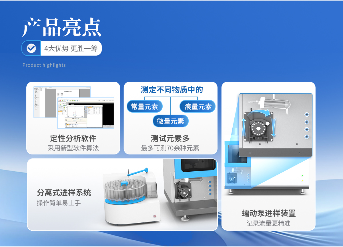 1、測試元素多,*多可測 70 余種元素。 2、多元素同時測試,一次進樣所有元素同時測試。 3、分析速度快,每分鐘約 5 個元素,*快測試速度可到每分鐘 10 個元素。 4、檢出限低,絕大多數(shù)元素可達 ppb 級。 5、線性范圍寬,可達 5-6 個數(shù)量級,可以實現(xiàn)高低含量同時測試,無需更換標 準曲線。 6、化學干擾少,測試結(jié)果更加精準。