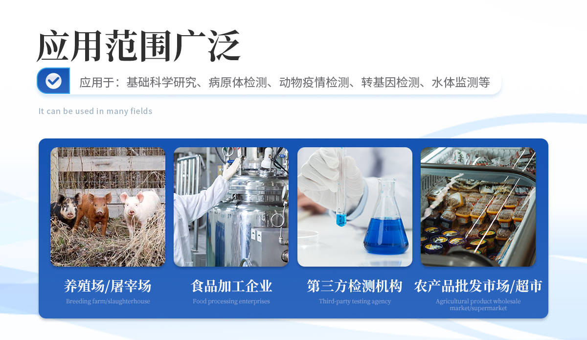 | 1、食品安全: 致病微生物、農(nóng)獸藥殘留、生物毒素等快速篩查。 | 2、★科研與生物安全: 免疫層析實驗分析、生物因子檢測。 | 3、其他領域: 所有使用膠體金免疫層析試紙條的場景。 |
