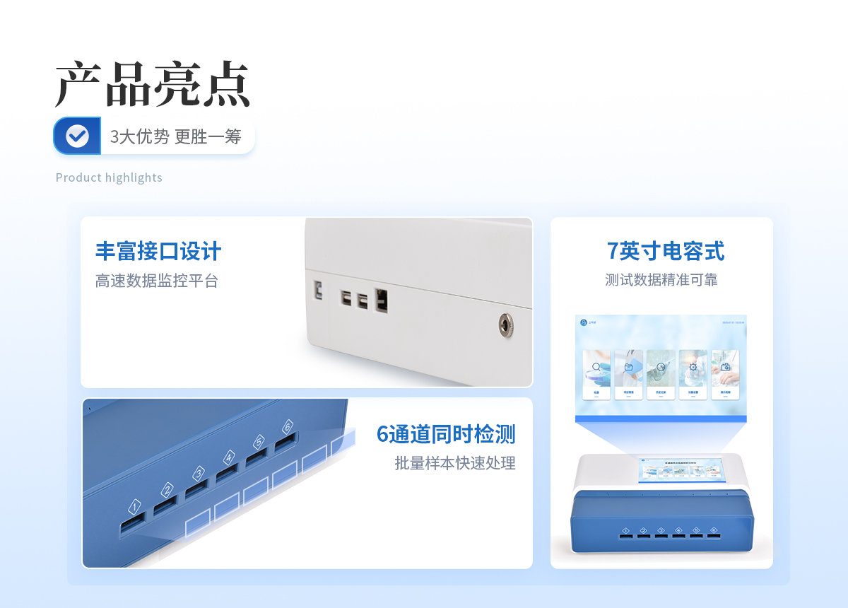 | 1、 ★Android觸控系統(tǒng)結合大尺寸高清屏幕,界面友好,操作簡單流暢,無需外接設備; | 2、 ★單卡+多聯(lián)卡設計方案,顯著提升檢測效率,滿足批量樣本快速處理需求; | 3、 可以500萬條檢測結果,支持按日期靈活查詢、預覽、刪除結果,并生成多樣化專業(yè)報告。 | 4、 內(nèi)置熱敏打印機,檢測完成即可現(xiàn)場打印標準報告,提升工作效率。 | 5、 關鍵部件實時自診斷功能,保障儀器長期穩(wěn)定運行。 | 6、 高速有線/無線網(wǎng)絡及藍牙,構建完善的數(shù)據(jù)監(jiān)控平臺,實現(xiàn)數(shù)據(jù)實時上傳、遠程查詢、統(tǒng)計分析和監(jiān)管協(xié)同。 | 7、 豐富的接口設計,輕松連接電腦、U盤、網(wǎng)絡及上位機系統(tǒng),支持U盤導出。 | 8、★ 孵育模塊為特定試紙條反應提供**溫度環(huán)境。 | 9、 流線型結構,緊湊輕便,兼顧實驗室耐用性與檢測需求。 | 10、 二維碼掃描錄入樣本信息,避免人工錯誤。 | 11、★ 插卡判斷:檢測卡未插入檢測通道不能內(nèi)置質(zhì)控功能,可設備送檢、設備自檢、試劑卡自檢測方式:孵育檢測、即時檢測(對檢測數(shù)據(jù)復檢核實) | 12、 檢測曲線:可以對試劑卡的檢測核驗,防止誤判 | 13、★ 檢測結果:報告出檢測項目、被測物質(zhì)的濃度、檢測單位、被檢查單位、檢驗員、檢測時間、檢測限等信息可在觸摸屏上顯示,可通過儀器內(nèi)置打印機輸出 | 14、 項目管理:支持檢測項目拓展功能 | 15、 界面設置:可修改標題和頁尾信息,靈活展示儀器信息 |