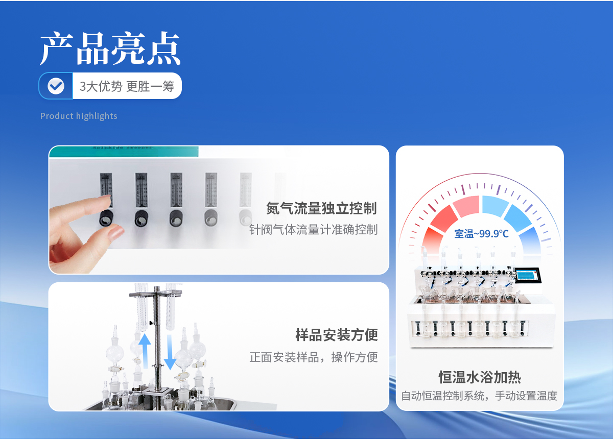 1、大容量反應(yīng)瓶,可同時處理多個樣品。 2、鹽酸口、氣體進(jìn)口、出口三口一體且相互獨立,操作會不干擾。 3、恒溫水浴加熱,具有快速自動恒溫控制系統(tǒng),加熱溫度可以手動設(shè)定。 4、由升降位置固定旋鈕調(diào)節(jié)樣品架及配氣系統(tǒng)的升降旋轉(zhuǎn)樣品架,正面安裝樣品,操作方便。 5、每個樣品的氮氣流量獨立控制調(diào)節(jié)或關(guān)閉,針閥氣體流量計準(zhǔn)確控制和顯示氣體總消耗量。