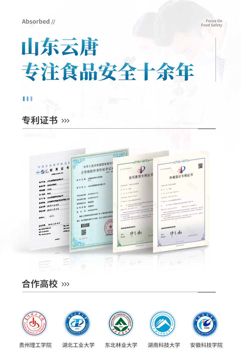 山東云唐智能科技有限公司生產(chǎn)的果蔬肉類檢測儀,采用手提箱式一體化設計,可快速檢測幾十種項目,包含各種蔬菜水果中有機磷和氨基甲酸酯類農(nóng)藥殘留,病害肉診斷:肉中組胺、揮發(fā)性鹽基氮;各種肉食品中瘦肉精激素類殘留、抗生素、獸藥殘留等現(xiàn)場的定性定量檢測。 該果蔬肉類檢測儀為集成化食品安全快速檢測分析設備,目前已于食藥監(jiān)局、衛(wèi)生部門、高教院校、科研院所、農(nóng)業(yè)部門、養(yǎng)殖場、屠宰場、食品肉產(chǎn)品深加工企業(yè)及檢驗檢疫部門等單位廣泛使用。