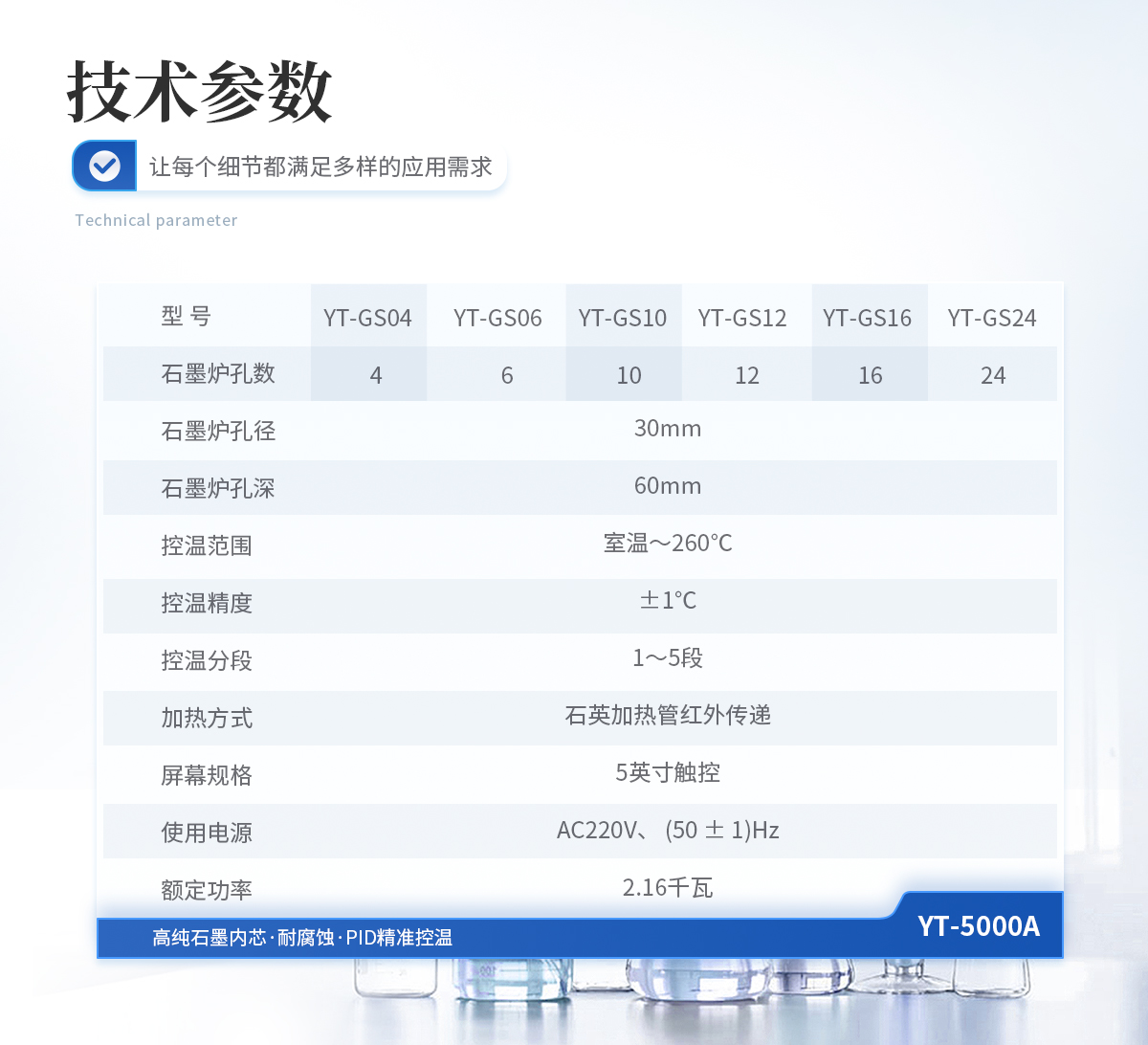 使用5寸彩色觸摸屏進行儀器操作,配備安卓操作系統(tǒng),方便快捷。 采用PID 控溫技術,控溫精度高,升溫速度快, 從室溫到260℃僅需25分鐘。 分段控溫設置,即可單段升溫,也可多段升溫,設置靈活,儀器將自動按順序完成。更適于易產生泡沫的樣品。 采用優(yōu)質石墨爐內芯,平均溫差較小,樣品效果一致性好,熱傳導效率更高。石墨塊具有特氟龍涂層,耐腐蝕,延長使用壽命。