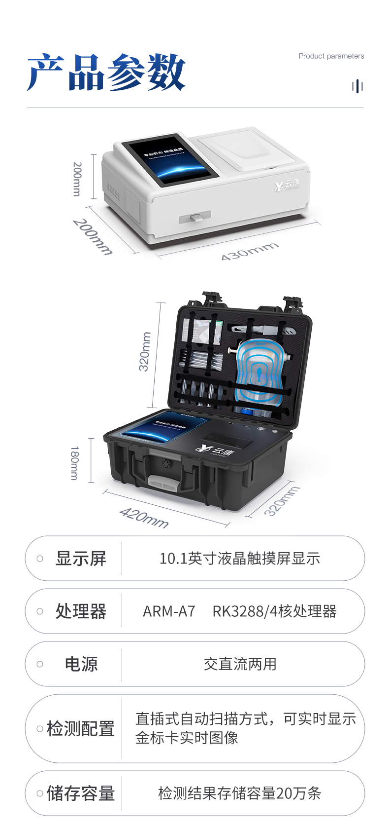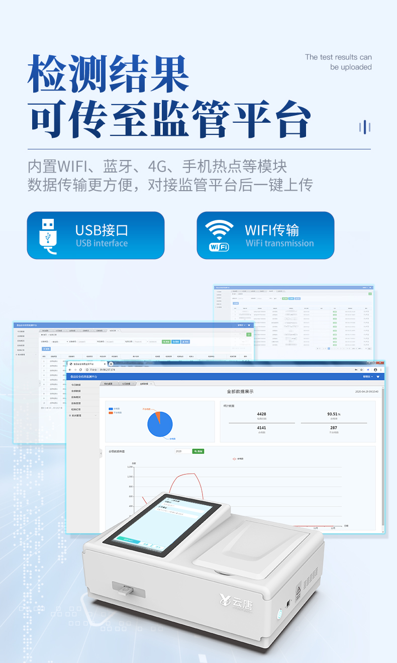 | 儀器采用手提式一體化系統(tǒng)檢測(cè)技術(shù),將分光光度模塊、新型農(nóng)殘檢測(cè)模塊、數(shù)字化管理模塊、無線通訊模塊高度集成于一體,支持檢測(cè)200種食品安全檢測(cè)項(xiàng)目,同時(shí)預(yù)留升級(jí)檢測(cè)方法。 | 儀器檢測(cè)模塊標(biāo)準(zhǔn)化、智能化,檢測(cè)項(xiàng)目可隨意自由組合。檢測(cè)箱體內(nèi)置多個(gè)標(biāo)準(zhǔn)檢測(cè)單元,檢測(cè)模塊可以調(diào)整配置。 | 顯示屏幕:儀器采用10.1英寸豎向液晶觸摸屏顯,搭配運(yùn)行安卓智能操作系統(tǒng),主控芯片采用ARM Cortex-A7,RK3288/4核處理器,主頻1.88Ghz,操作方便,性能更強(qiáng)。 | 檢測(cè)通道:≥12通道;采用精密旋轉(zhuǎn)比色池設(shè)計(jì),使用同芯片同光源校準(zhǔn)精度,解決不同光源之間的誤差值,更加準(zhǔn)確**。(1-12通道間誤差0.1%,***:**202022821055.2) | 儀器光源:高精度進(jìn)口四波長(zhǎng)冷光源,每個(gè)通道均配置 410、520、590、630nm 波長(zhǎng)光源,標(biāo)配**的光路切換裝置,專利光路切換功能可實(shí)現(xiàn)64波長(zhǎng),并且所有檢測(cè)項(xiàng)目可實(shí)現(xiàn)所有通道同時(shí)檢測(cè)。 | 設(shè)備可一鍵校準(zhǔn),自動(dòng)保存校準(zhǔn)數(shù)據(jù),自動(dòng)對(duì)比校驗(yàn),得到精準(zhǔn)光源,采用Android SP存儲(chǔ)數(shù)據(jù),光源數(shù)據(jù)永不丟失,方便每一次使用。 | 通訊接口:配備無線通信模塊、4G(APN)通訊模塊、藍(lán)牙傳輸,同時(shí)具有雙USB接口以及RJ45網(wǎng)線接口,可以多方式實(shí)現(xiàn)數(shù)據(jù)保存及數(shù)據(jù)傳輸 | 存儲(chǔ)方式:支持U盤存儲(chǔ),標(biāo)準(zhǔn)USB接口,免驅(qū)動(dòng)安裝。檢測(cè)結(jié)果存儲(chǔ)容量20萬條以上,可生成Excel表格進(jìn)行拷貝,并具有登錄保護(hù)功能。 | 智能化操作系統(tǒng): | 1)操作系統(tǒng):儀器可在同一檢測(cè)界面自動(dòng)對(duì)應(yīng)相關(guān)檢測(cè)通道,一次性選擇1-12個(gè)樣品名稱,無需退出界面,節(jié)省操作時(shí)間。并可以對(duì)每個(gè)通道屬性和樣品信息單獨(dú)進(jìn)行編輯,例如送檢單位、人員,檢測(cè)人員等,打印時(shí)勾選打印顯示。 | 2)數(shù)據(jù)集成系統(tǒng):設(shè)備首頁自動(dòng)匯總分析檢測(cè)數(shù)據(jù),包含:周檢測(cè)數(shù)據(jù)、月檢測(cè)數(shù)據(jù),全部檢測(cè)總數(shù)量,均包含檢測(cè)總數(shù),合格數(shù),不合格數(shù),以及相關(guān)柱形分析圖,各項(xiàng)檢測(cè)數(shù)據(jù)一目了然,無需電腦查詢,更加快捷直觀。 | 3)數(shù)據(jù)庫系統(tǒng):十幾項(xiàng)數(shù)據(jù)庫分類管理儀器:包含項(xiàng)目類型、項(xiàng)目數(shù)據(jù)、檢測(cè)數(shù)據(jù)、歷史記錄、國(guó)標(biāo)信息、曲線信息、采樣信息、檢測(cè)信息、受檢信息、復(fù)核信息、圖表信息、光源校準(zhǔn)信息、打印樣式信息、樣品庫信息等等,數(shù)據(jù)庫之間互相協(xié)調(diào)聯(lián)動(dòng)保證數(shù)據(jù)的真實(shí)完整性。同時(shí)產(chǎn)品數(shù)據(jù)庫以及歷史檢測(cè)記錄支持一鍵檢索功能。 | 4)限量規(guī)判系統(tǒng):具有限量查詢、添加物質(zhì)合規(guī)判定系統(tǒng)。檢測(cè)出結(jié)果后,系統(tǒng)自動(dòng)調(diào)用系統(tǒng)數(shù)據(jù)庫中相關(guān)國(guó)標(biāo)進(jìn)行比對(duì)判定,客觀顯示判定結(jié)果是否合格。 | 5)項(xiàng)目預(yù)設(shè)系統(tǒng):儀器具有任務(wù)預(yù)設(shè)模塊,一鍵提前預(yù)設(shè),給出方便快捷的新檢測(cè)方案,每一個(gè)任務(wù)分別可以設(shè)置不同的樣品、批次、編號(hào)、來源、備注、抽樣信息、檢測(cè)信息、受檢信息、復(fù)核信息等更多信息。樣品送檢時(shí)一鍵調(diào)取保存信息,并可多次調(diào)取,大大提高檢測(cè)效率。 | 6)數(shù)據(jù)監(jiān)管系統(tǒng):同步對(duì)接監(jiān)管平臺(tái),數(shù)據(jù)可局域網(wǎng)和互聯(lián)網(wǎng)數(shù)據(jù)上傳,檢測(cè)結(jié)果可選擇直接傳至食品安全監(jiān)管平臺(tái)。進(jìn)行區(qū)域食品安全監(jiān)管及大數(shù)據(jù)分析處理與數(shù)據(jù)統(tǒng)計(jì),檢測(cè)區(qū)域食品安全長(zhǎng)短期動(dòng)態(tài),達(dá)到食品安全問題預(yù)估、預(yù)警。 | 7)打印系統(tǒng):內(nèi)置全新打印機(jī),新創(chuàng)自定義打印方式,可按需靈活勾選控制:產(chǎn)品合格證(國(guó)家農(nóng)業(yè)部標(biāo)準(zhǔn)要求),二維碼,抽樣信息、檢測(cè)信息,受檢信息、復(fù)核信息、抽樣日期、檢測(cè)日期等信息的打印。 | 供電模式:儀器交直流兩用,直流12V供電,可連接車載電源,可配6ah大容量充電鋰電池,電量可實(shí)時(shí)顯示,方便戶外流動(dòng)測(cè)試。 | 膠體金檢測(cè)模塊:采用雙通道CMOS成像處理技術(shù)及膠體金免疫層析技術(shù),可同時(shí)讀取雙膠體金卡數(shù)據(jù),自動(dòng)采集、處理分析,將檢測(cè)結(jié)果顯示,并可根據(jù)參考限值自動(dòng)判斷檢測(cè)結(jié)果,可檢測(cè)常見的獸藥殘留、生物毒素、抗生素、違禁添加物等。 | 1)探測(cè)技術(shù):CMOS成像探測(cè); | 2)檢測(cè)通道:1個(gè)通道; | 3)檢測(cè)方式:消線法和比色法; | 4)顯示模式:陰性或陽性; | 5)曲線形式:軌道式掃描方式,顯示金標(biāo)卡圖像,實(shí)時(shí)生