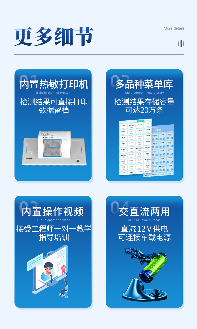 | 儀器采用手提一體化系統(tǒng)檢測(cè)技術(shù),將分光光度模塊、數(shù)字化管理模塊、無(wú)線通訊模塊高度集成于一體,可支持檢測(cè)60種食品安全檢測(cè)項(xiàng)目,同時(shí)預(yù)留升級(jí)檢測(cè)方法。 | 儀器檢測(cè)模塊標(biāo)準(zhǔn)化、智能化,檢測(cè)項(xiàng)目可隨意自由組合。檢測(cè)箱體內(nèi)置多個(gè)標(biāo)準(zhǔn)檢測(cè)單元,檢測(cè)模塊可以調(diào)整配置。 | 顯示屏幕:儀器采用10.1英寸豎向液晶觸摸屏顯,搭配運(yùn)行安卓智能操作系統(tǒng),主控芯片采用ARM Cortex-A7,RK3288/4核處理器,主頻1.88Ghz,操作方便,性能更強(qiáng)。 | 檢測(cè)通道:≥12通道;采用精密旋轉(zhuǎn)比色池設(shè)計(jì),使用同芯片同光源校準(zhǔn)精度,解決不同光源之間的誤差值,更加準(zhǔn)確**。(1-12通道間誤差0.1%,***:**202022821055.2) | 儀器光源:高精度進(jìn)口四波長(zhǎng)冷光源,每個(gè)通道均配置 410、520、590、630nm 波長(zhǎng)光源,標(biāo)配**的光路切換裝置,專利光路切換功能可實(shí)現(xiàn)64波長(zhǎng),并且所有檢測(cè)項(xiàng)目可實(shí)現(xiàn)所有通道同時(shí)檢測(cè)。 | 設(shè)備可一鍵校準(zhǔn),自動(dòng)保存校準(zhǔn)數(shù)據(jù),自動(dòng)對(duì)比校驗(yàn),得到精準(zhǔn)光源,采用Android SP存儲(chǔ)數(shù)據(jù),光源數(shù)據(jù)永不丟失,方便每一次使用。 | 通訊接口:配備無(wú)線通信模塊、4G(APN)通訊模塊、藍(lán)牙傳輸,同時(shí)具有雙USB接口以及RJ45網(wǎng)線接口,可以多方式實(shí)現(xiàn)數(shù)據(jù)保存及數(shù)據(jù)傳輸。 | 存儲(chǔ)方式:支持U盤(pán)存儲(chǔ),標(biāo)準(zhǔn)USB接口,免驅(qū)動(dòng)安裝。檢測(cè)結(jié)果存儲(chǔ)容量20萬(wàn)條以上,可生成Excel表格進(jìn)行拷貝,并具有登錄保護(hù)功能。 | 智能化操作系統(tǒng): | 1、操作系統(tǒng):儀器可在同一檢測(cè)界面自動(dòng)對(duì)應(yīng)相關(guān)檢測(cè)通道,一次性選擇1-12個(gè)樣品名稱,無(wú)需退出界面,節(jié)省操作時(shí)間。并可以對(duì)每個(gè)通道屬性和樣品信息單獨(dú)進(jìn)行編輯,例如送檢單位、人員,檢測(cè)人員等,打印時(shí)勾選打印顯示。 | 2、數(shù)據(jù)集成系統(tǒng):設(shè)備首頁(yè)自動(dòng)匯總分析檢測(cè)數(shù)據(jù),包含:周檢測(cè)數(shù)據(jù)、月檢測(cè)數(shù)據(jù),全部檢測(cè)總數(shù)量,均包含檢測(cè)總數(shù),合格數(shù),不合格數(shù),以及相關(guān)柱形分析圖,各項(xiàng)檢測(cè)數(shù)據(jù)一目了然,無(wú)需電腦查詢,更加快捷直觀。 | 3、數(shù)據(jù)庫(kù)系統(tǒng):十幾項(xiàng)數(shù)據(jù)庫(kù)分類管理儀器:包含項(xiàng)目類型、項(xiàng)目數(shù)據(jù)、檢測(cè)數(shù)據(jù)、歷史記錄、國(guó)標(biāo)信息、曲線信息、采樣信息、檢測(cè)信息、受檢信息、復(fù)核信息、圖表信息、光源校準(zhǔn)信息、打印樣式信息、樣品庫(kù)信息等等,數(shù)據(jù)庫(kù)之間互相協(xié)調(diào)聯(lián)動(dòng)保證數(shù)據(jù)的真實(shí)完整性。同時(shí)產(chǎn)品數(shù)據(jù)庫(kù)以及歷史檢測(cè)記錄支持一鍵檢索功能。 | 4、限量規(guī)判系統(tǒng):具有限量查詢、添加物質(zhì)合規(guī)判定系統(tǒng)。檢測(cè)出結(jié)果后,系統(tǒng)自動(dòng)調(diào)用系統(tǒng)數(shù)據(jù)庫(kù)中相關(guān)國(guó)標(biāo)進(jìn)行比對(duì)判定,客觀顯示判定結(jié)果是否合格。 | 5、項(xiàng)目預(yù)設(shè)系統(tǒng):儀器具有任務(wù)預(yù)設(shè)模塊,一鍵提前預(yù)設(shè),給出方便快捷的新檢測(cè)方案,每一個(gè)任務(wù)分別可以設(shè)置不同的樣品、批次、編號(hào)、來(lái)源、備注、抽樣信息、檢測(cè)信息、受檢信息、復(fù)核信息等更多信息。樣品送檢時(shí)一鍵調(diào)取保存信息,并可多次調(diào)取,大大提高檢測(cè)效率。 | 6、數(shù)據(jù)監(jiān)管系統(tǒng):同步對(duì)接監(jiān)管平臺(tái),數(shù)據(jù)可局域網(wǎng)和互聯(lián)網(wǎng)數(shù)據(jù)上傳,檢測(cè)結(jié)果可選擇直接傳至食品安全監(jiān)管平臺(tái)。進(jìn)行區(qū)域食品安全監(jiān)管及大數(shù)據(jù)分析處理與數(shù)據(jù)統(tǒng)計(jì),檢測(cè)區(qū)域食品安全長(zhǎng)短期動(dòng)態(tài),達(dá)到食品安全問(wèn)題預(yù)估、預(yù)警。 | 7.1、全新打印系統(tǒng):內(nèi)置全新打印機(jī),新創(chuàng)自定義打印方式,可按需靈活勾選控制:二維碼,抽樣信息、檢測(cè)信息,受檢信息、復(fù)核信息、抽樣日期、檢測(cè)日期等信息的打印。 | 7.2、A4紙版本報(bào)告打印功能(可選配):設(shè)備擁有兩種結(jié)果展示方式,可以自動(dòng)生成A4打印模板和小票打印模板兩種樣式,可通過(guò)WiFi及網(wǎng)線等方式鏈接外置打印機(jī)可進(jìn)行打印。 | 供電模式:儀器交直流兩用,直流12V供電,可連接車(chē)載電源,可配6ah大容量充電鋰電池,電量可實(shí)時(shí)顯示,方便戶外流動(dòng)測(cè)試。 | 儀器具備遠(yuǎn)程升級(jí)功能,可定向分客戶分儀器更新,開(kāi)機(jī)后自動(dòng)更新,并可持續(xù)性免費(fèi)更新系統(tǒng)版本,無(wú)需像傳統(tǒng)產(chǎn)品返廠更新,節(jié)省時(shí)間及人力成本并避免了物流運(yùn)輸返廠升級(jí)導(dǎo)致設(shè)備損壞的潛在風(fēng)險(xiǎn)。 |