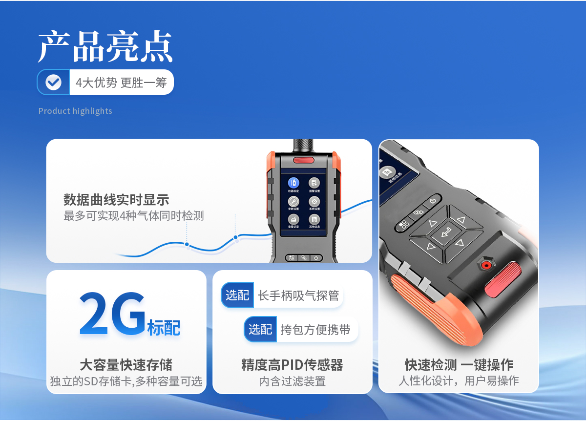 1、快速** 采用原裝進口PID傳感器,精度高 儀器內(nèi)含過濾裝置,**過濾油、水、粉塵等雜質(zhì) 即使在*嚴苛的工業(yè)環(huán)境中,檢測結(jié)果依然可以信賴 2、人性化設(shè)計,用戶易操作 3.5寸高清彩屏,開機即可檢測 純硬件一鍵開關(guān)機, 減小電量消耗 選配長手柄吸氣探管 選配挎包方便隨身攜帶 “跑車”造型,美觀大方 3、功能全面 同時顯示實現(xiàn)數(shù)據(jù)和濃度曲線 配置高低速可調(diào)的氣泵 *多可實現(xiàn)4種氣體同時檢測 可選配外置藍牙打印機,檢測數(shù)據(jù)實現(xiàn)移動打印 可選配藍牙、ZIGBEE等多種無線通訊方式 支持多種氣體顯示單位任意切換,濃度值由系統(tǒng)自動換算 中英文自由切換顯示 大容量快速存儲功能,存儲空間可以定制 Micro-USB接口充電器,方便隨時充電 安卓手機通用數(shù)據(jù)線,方便連接電腦讀取歷史數(shù)據(jù) 可以在高溫、高濕、高粉塵環(huán)境氣體檢測(需配采樣探槍)