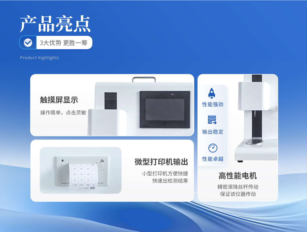 | 1、采用芯片控制,高精度測(cè)力傳感器,精度高。 | 2、采用高性能電機(jī),滾珠絲桿傳動(dòng),保證該儀器傳動(dòng)。 | 3、大觸摸屏中文顯示,友好人機(jī)界面操作。全自動(dòng)完成測(cè)試。操作方便,具有測(cè)試數(shù)據(jù)統(tǒng)計(jì)處理功能,微型打印機(jī)輸出。 |