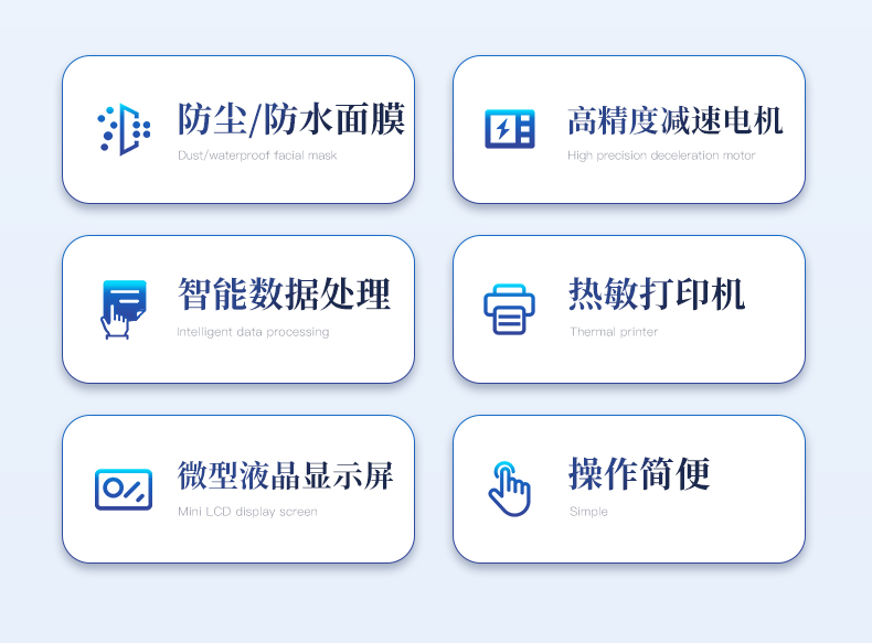 | 防塵、防水面膜、薄膜按鍵和微型液晶顯示屏 | 高精度減速電機(jī)及調(diào)速器組成的振動部分 | CPU 智能數(shù)據(jù)處理部分 | 高分辨率熱敏打印機(jī) | 測量結(jié)果**小數(shù)后4 位 | 儀器結(jié)構(gòu)牢固,外型美觀,操作簡便 |