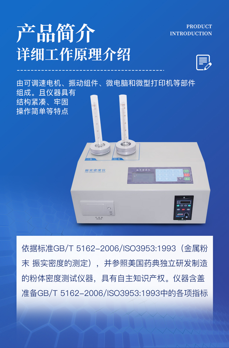 技術(shù)原理:YT-ZS2型粉體密度測試儀是由丹東市恒瑞儀器有限公司依據(jù)標(biāo)準(zhǔn)GB/T 5162-2006/ISO3953:1993(金屬粉末 振實(shí)密度的測定),并參照美國藥典獨(dú)立研發(fā)制造的粉體密度測試儀器,具有自主知識產(chǎn)權(quán)。儀器含蓋準(zhǔn)備GB/T 5162-2006/ISO3953:1993中的各項(xiàng)指標(biāo)。YT-ZS2型粉體密度測試儀由可調(diào)速電機(jī)、振動組件、微電腦和微型打印